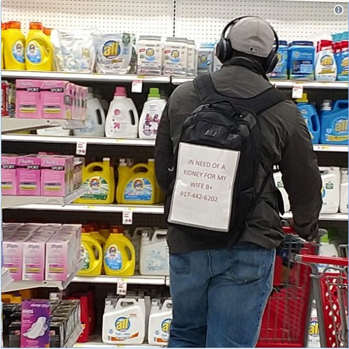 Суретте ер адам артқа қарап тұр, оның жолдорбасына «Әйеліме бүйрек керек» деген хабарландыру және телефон нөмірі жабыстырылған, деп жазды Сегодня ақпараттық басылымына сілтеме жасап sputniknews.kz.