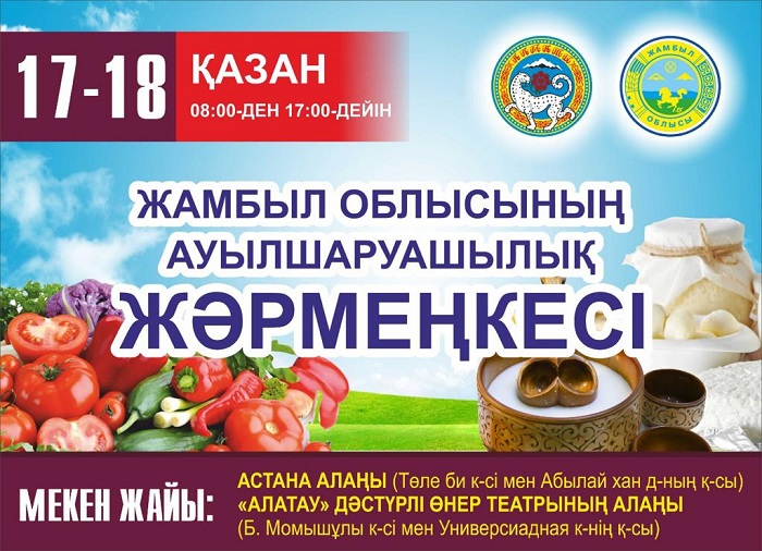 Мегополисте азық-түлік белдеуін құру және Жамбыл облысы мен Алматы қаласы арасында өңіраралық ынтымақтастықты дамыту аясында 17-18 қазан күндері «Астана» орталық алаңында (Абылай хан даңғылынан Назарбаев даңғылына дейін) және «Алатау» (Нұркент ықшамауданы, 6) концерт залының жанында ауыл шаруашылығы өнімдерінің жәрмеңкесі өтеді.