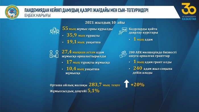 Сонымен қатар «Еңбек» бағдарламасы бойынша жұмысқа орналастыру шараларымен 38,3 мың жұмыспен қамтылды. Оның ішінде тұрақты жұмысқа – 25 759 адам, уақытша жұмыс орындарына – 10 670 адам (қоғамдық жұмыстарға – 7 986 адам, жастар практикасына – 1 491 адам, әлеуметтік жұмыс орындарына – 1 193 адам) жұмысқа орналастырылды. Бизнес ашу үшін 1 293 адамға гранттар берілді, 113 адамға микрокредиттер берілді, 1 031 адам қысқа мерзімді оқуға жіберілді. Жұмысқа орналасқандардың 17,1 мыңы әлеуметтік осал топтарға жатады.