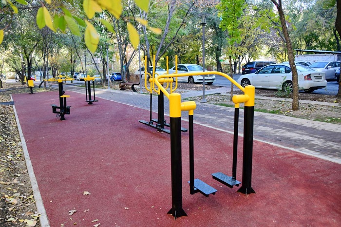 Орындықтар, урналар орнатылған, 2 workout алаңы бар.