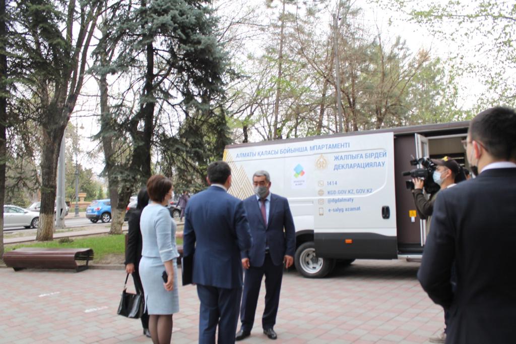 Алматы қаласы бойынша сыбайлас жемқорлыққа қарсы қызметінің басшысы және "Алматы – адалдық алаңы" жобалық кеңсесінің басшысы мобильді "дөңгелектегі кеңсе" жұмысымен танысты. Мобильді "доңғалақтағы кеңсе" Мемлекеттік кірістер органдарының құзыретіне кіретін мәселелер бойынша практикалық және консультациялық көмекті жүзеге асыруға мүмкіндік береді.
