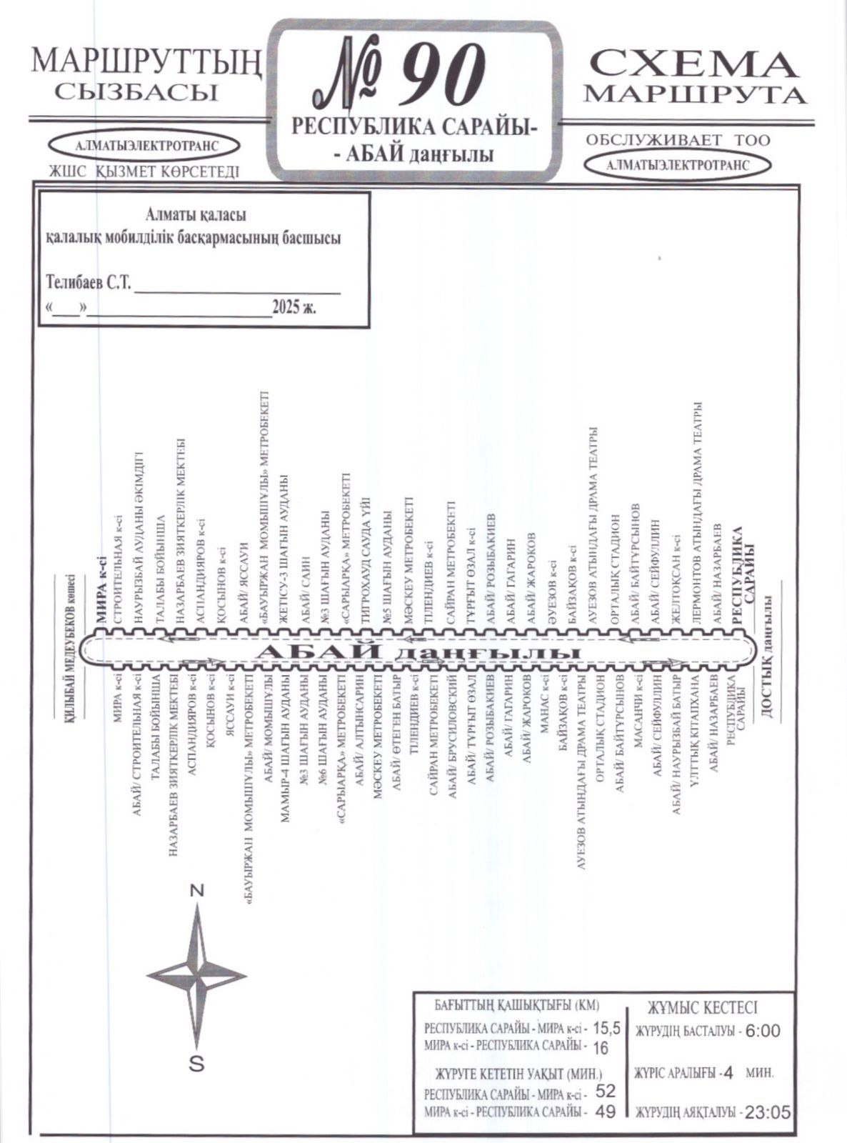 №90 бағыттағы автобус Абай даңғылы бойымен – К.Медеубеков көшесінен Республика сарайына дейін қатынайды. Бұл жаңа бағыт Наурызбай ауданындағы Қалқаман және Шұғыла шағынаудандары тұрғындарының қатынасын жеңілдетеді.