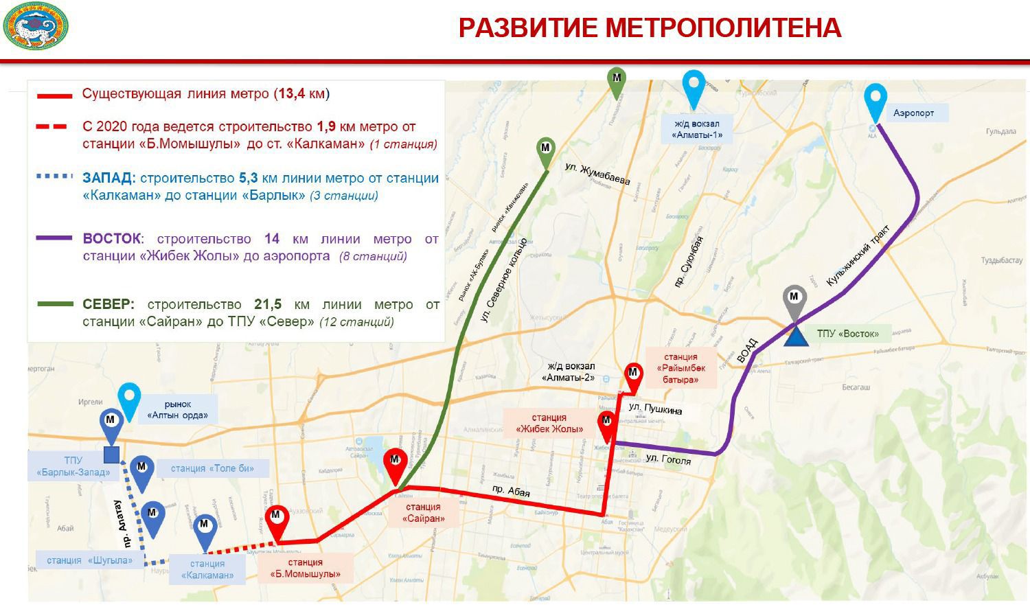 Метро құрылысына қатысты әкімге мынадай мәлімет берілді: қазіргі желіні «Қалқаман» метро бекетінен «Барлық» базарына дейін ұзартуға арналған жобалық-сметалық құжаттама дайын. Бұл учаскеде 3 жаңа бекет қарастырылған. Құрылысты мемлекеттік сараптама қорытындысынан кейін бастау жоспарланған. Бұған қоса, «Жібек Жолы» метро бекетінен әуежайға дейінгі екінші желінің техникалық-экономикалық негіздемесі әзірленіп жатыр. Ол да қазан айында дайын болады. Ал үшінші желі «Сайран» метро бекетінен Алатау қаласына дейін созылып, бұл бағыт бойынша да құжаттама әзірленуде.
