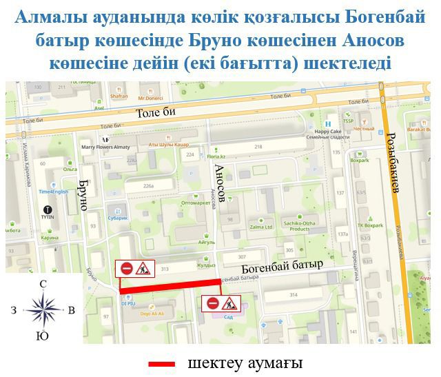 «Алматы жылу желілері» ЖШС хабарлауынша, 31 мамырдан 20 шілдеге дейін Алмалы ауданында Бөгенбай батыр көшесінің Бруно көшесінен Аносов көшесіне дейінгі бөлігінде екі бағытта да көлік қозғалысы шектеледі.