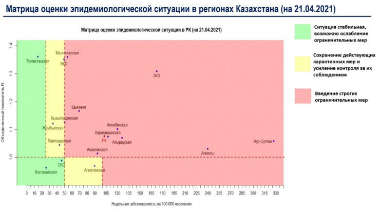 ҚР Үкіметі жанындағы Қазақстанда коронавирустың таралуына жол бермеу жөніндегі ведомствоаралық комиссияның Telegram каналында еліміздің өңірлеріндегі 21 сәуіріндегі эпидемиологиялық жағдайды бағалау матрицасы жарияланды.