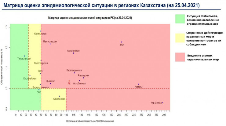 ҚР Үкіметі жанындағы Қазақстанда коронавирустың таралуына жол бермеу жөніндегі ведомствоаралық комиссияның Telegram каналында еліміздің өңірлеріндегі 25 сәуірдегі эпидемиологиялық жағдайды бағалау матрицасы жарияланды, деп хабарлайды Almaty.tv тілшісі ҚазАқпаратқа сілтеме жасап.