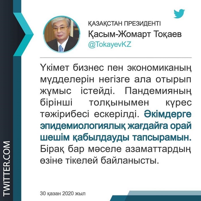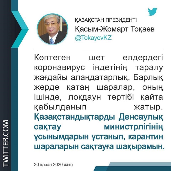 «Көптеген шет елдердегі коронавирус індетінің таралу жағдайы алаңдатарлық. Барлық жерде қатаң шаралар, оның ішінде, локдаун тәртібі қайта қабылданып жатыр. Қазақстандықтарды денсаулық сақтау министрлігінің ұсынымдары мен карантин шараларын сақтауға шақырамын», – деп жазды мемлекет басшысы Twitter парақшасында.