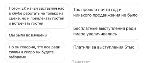 Топтың бұрынғы әншісі қыздардың көбісін клуб сахнасында өнер көрсетуге ғана емес, мейрамханаға қонақтар тартумен айналысуға мәжбүрлегенін айтты.
