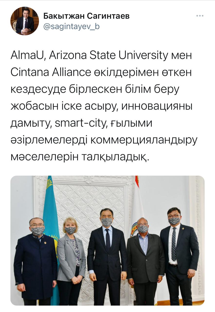 «AlmaU, Arizona State Universitу мен Cintana Alliance өкілдерімен өткен кездесуде бірлескен білім беру жобасын іске асыру, инновацияны дамыту, smart-city, ғылыми әзірлемелерді коммерцияландыру мәселелерін талқыладық», - деді Б. Сағынтаев.