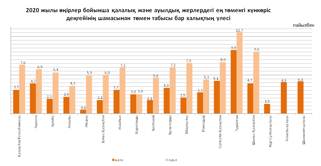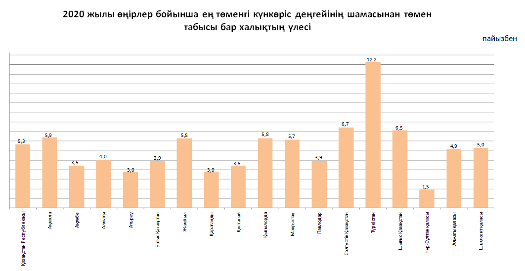 2020 жылы үй шаруашылықтарын зерттеу дерегі бойынша, табысы ең төменгі күнкөріс деңгейінің шамасына жетпейтін халық үлесі 5,3% құрады (2019 жылы – 4,3%). 2020 жылы кедейліктің ең жоғары мәндері тіркелген өңірлер: