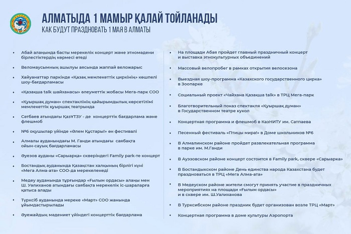 25 сәуір мен 1 мамыр аралығында қала тұрғындары мен қонақтары үшін 50-ге жуық түрлі мәдени-бұқаралық және спорттық іс-шара өтеді, деп хабарлайды Almaty.tv.