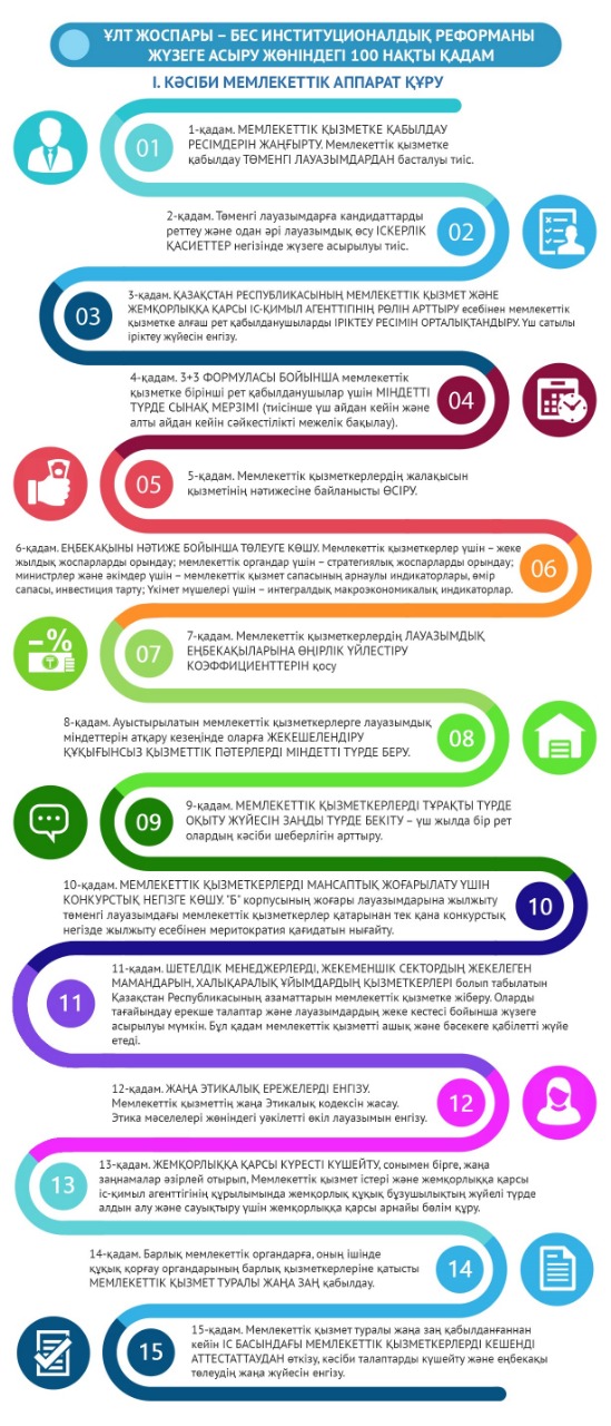 Кәсіби мемлекеттік аппарат құру реформасын жүзеге асы­ру мақсатында 15 нақты қадам белгіленді. Ондағы негізгі мәселе­лерге тоқталатын болсақ, сала мамандарын іріктеудің тәртібін күшейту, мемлекеттік қызметке қабылдаудың төменгі лауазымдардан басталуы, барлық мемлекеттік органдарға, оның ішінде құқық қорғау органдарының барлық қызметкерлеріне қатысты «Мем­лекеттік қызмет» туралы жаңа заң қабылдау және осы заң қабылданғаннан кейін жалақы­ларды қызметтік нәтижеге байланысты өсіру, барлық мемлекеттік қызметкерлерді кешенді аттестат­таудан өткізу мәселелері нақ­тыланған.