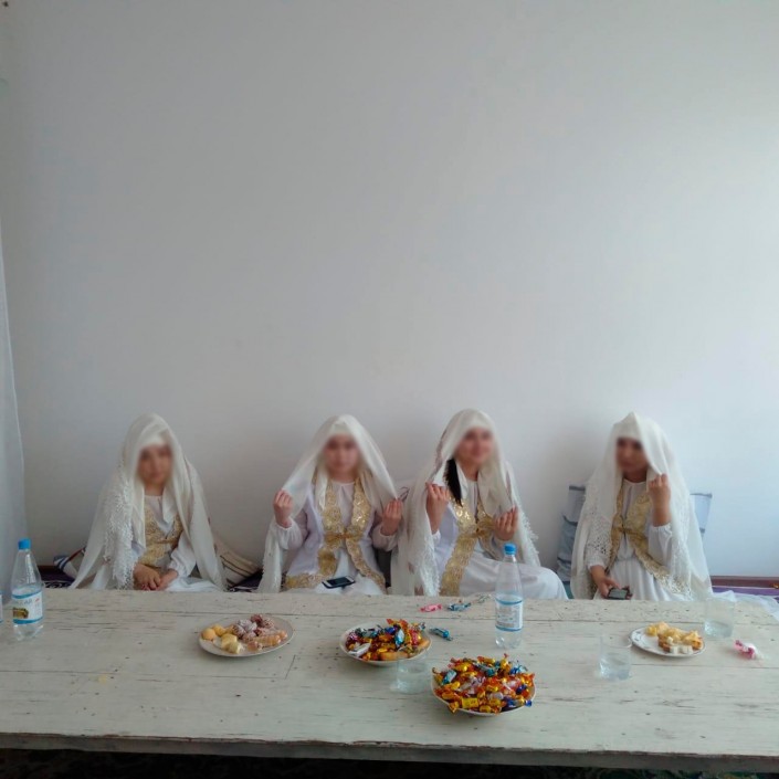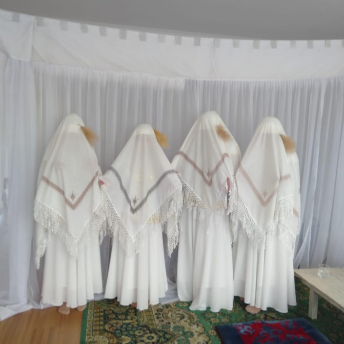 Қонақтар көшеде төрт келінді күтіп алып, олардың «беташары» болады. Жаңа түскен келіндер орамал тағып, қонақтардың алдында тұр.