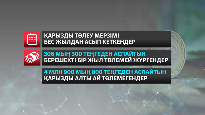 Одан бөлек, елімізде 1 млн-нан астам азамат несиелерді өтеу мерзімін бұзған. Вице-министрің айтуынша, коммуналдық төлем, салық бойынша берешегі бар азаматтардың да қатары мол. Қазір елімізде проблемалық несиелердің мөлшері шамамен 1 трлн теңге.