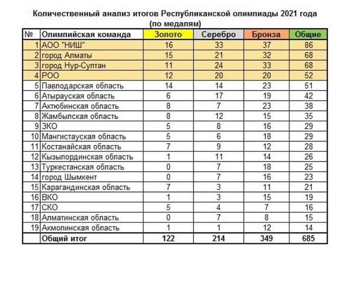 БИЛ оқушылары сарапқа салынған 122 алтын медальдың 38-ін, 214 күміс жүлденің 71-ін, 349 қола медальдың 120-сын, жалпы жиынтығы 229 медаль жеңіп алған. Бұл туралы "Білім-инновация" қорының вице-президенті Нұрбол Төлебаев өзінің facebook парақшасында мәлім етті.