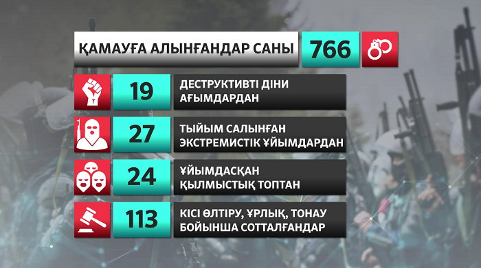 Сонымен, барлық органда бүгінгі таңда 766 күдікті қамауға алынған. Ұсталғандардың ішінде: деструктивті діни ағымдардың 19, тыйым салынған экстремистік ұйымдардың 27 белсендісі, ұйымдасқан қылмыстық топтың 24 мүшесі және 113 адам кісі өлтіру, ұрлық, тонау және тонау бойынша сотталғандар бар.