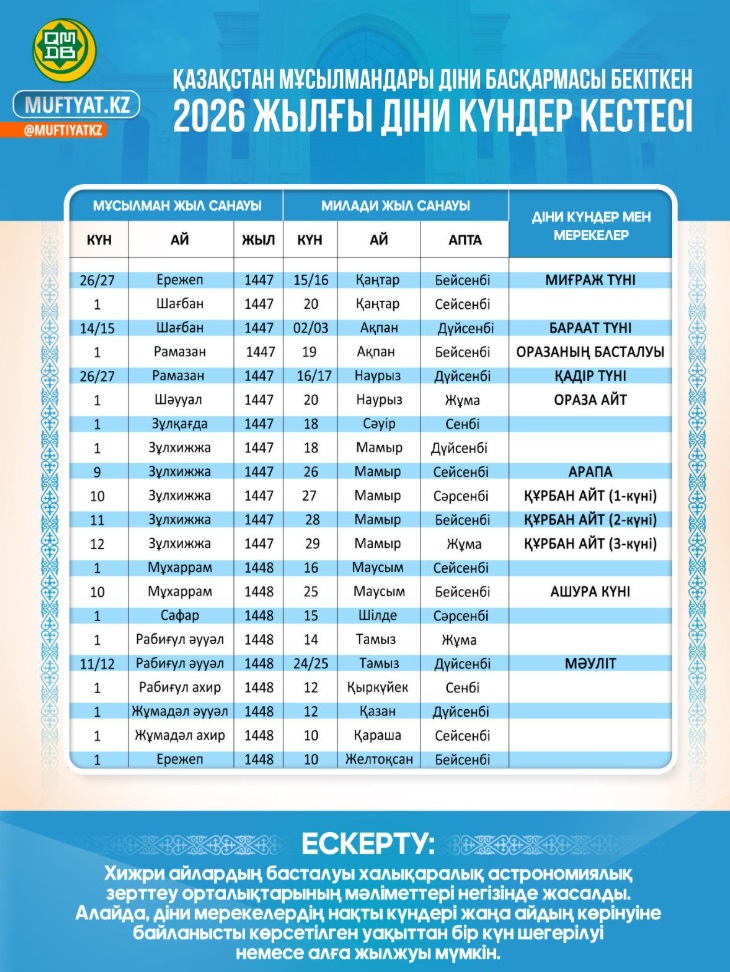 Қазақстан мұсылмандары діни басқармасының шариғат және пәтуа бөлімі 2026 жылғы діни күндер кестесін бекітті, деп хабарлайды Almaty.tv.