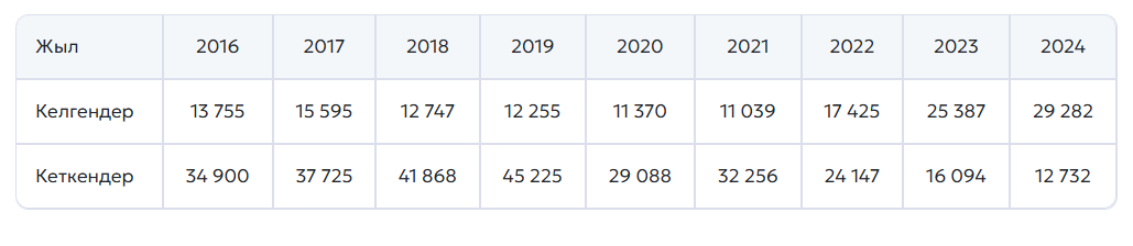 Төменде 2016-2024жж. иммигранттар мен эмигранттар саны көрсетілген: