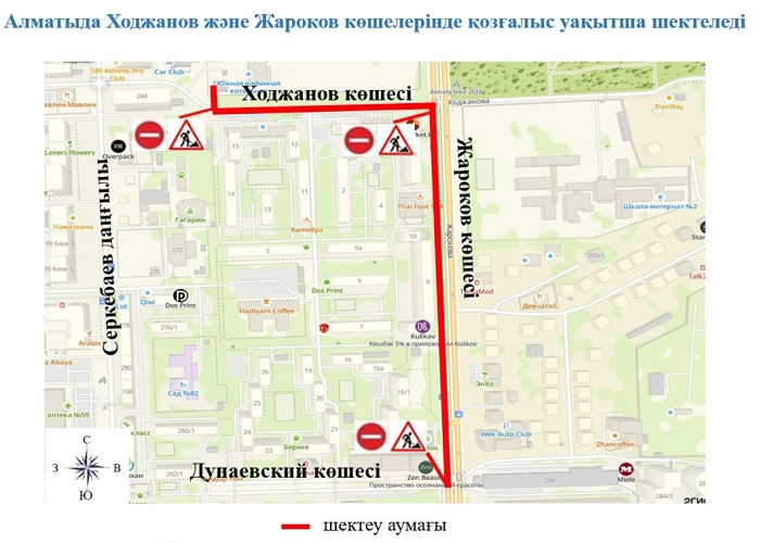 10 маусымнан бастап 1 қыркүйекке дейін көлік қозғалысы Қожанов көшесінің бойымен Гагарин көшесінен бастап Жароков көшесіне дейін, сондай-ақ Жароков көшесінің бойымен Қожанов көшесінен бастап Дунаевская көшесіне дейін оңтүстік бағытта көлік қозғалысы шектеледі. Солтүстік бағытта көлік қозғалысы екі бағытта ұйымдастырылады.