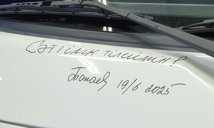 Президент еңбек ұжымына табыс тілеп, KIA Bongo автокөлігінің шанағына естелік қолжазба қалдырды.