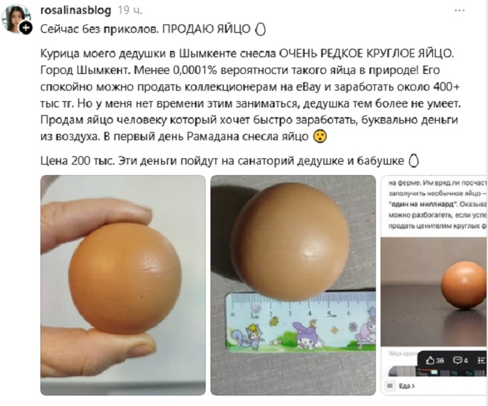 «Табиғатта мұндай жұмыртқаның кездесу мүмкіндігі 0,0001 пайызға тең. Мұны eBay-де коллекция жинаушыларға 400 мың теңгенің үстіндегі ақшаға сатуға болады. Менің қазір онымен айналысуға уақытым болмай тұр, сондықтан ауадан ақша жасап алғысы келетіндерге сатамын. Тауығымыз Рамазанның алғышқы күнінде жұмыртқалады. Бағасы 200 мың теңге. Түскен ақшаға атам мен әжемді демалысқа жіберемін», - деп жазған ол.