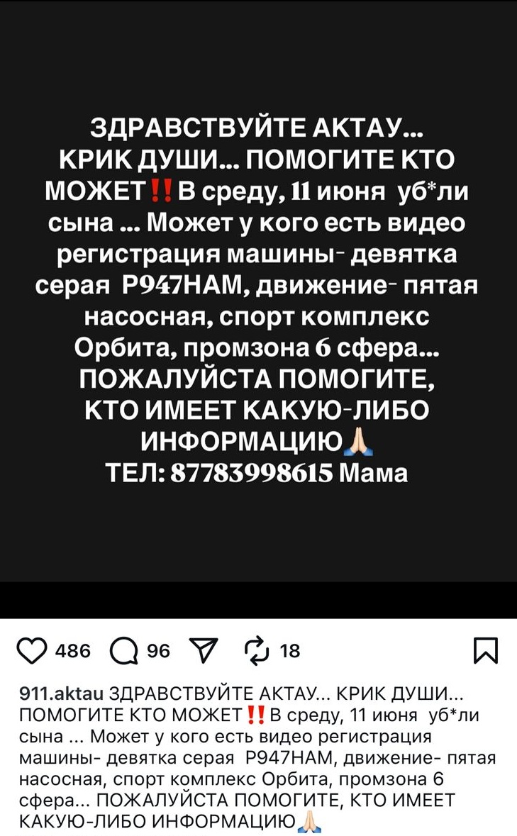 Бүгін, 15 маусымда жергілікті Instagram-парақшаларда Ақтау тұрғынының ұлының өлімінің мән-жайын анықтау үшін көмек сұраған өтініші пайда болды.