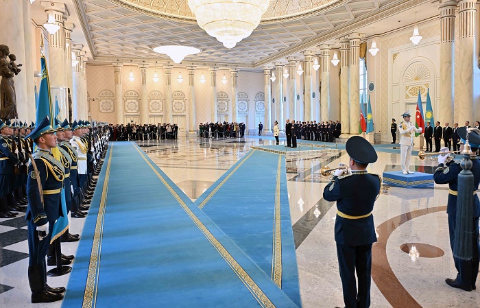 «Ақорда» резиденциясында Әзербайжан Президентін ресми қарсы алу рәсімі өтті. Қасым-Жомарт Тоқаев пен Ильхам Әлиев бір-біріне ресми делегация мүшелерін таныстырды, деп хабарлайды Аlmaty.tv Ақорданың баспасөз қызметіне сілтеме жасап