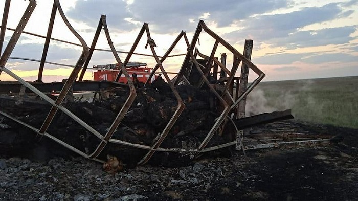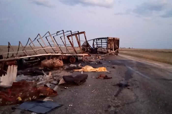 Тіркемесіне 40 жылқы тиелген «КамАЗ» бен бос келе жатқан Mersedes-Benz Actros жүк көлігі соқтығысып, түгелдей отқа оранған.