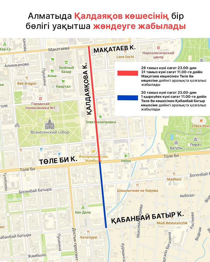 29 тамыз күні сағат 23.00-ден 31 тамыз күні сағат 11.00-ге дейін Мақатаев көшесінен Төле би көшесіне дейінгі аралықта қозғалыс жабылады, деп хабарлайды Almaty.tv.