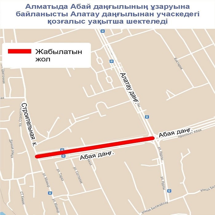 Мәселен, 19 қыркүйекте 23.00-ден 29 қыркүйекте 23.00-ге дейін Алатау даңғылынан Строительная көшесіне дейінгі учаскеде қозғалыс жабылады.