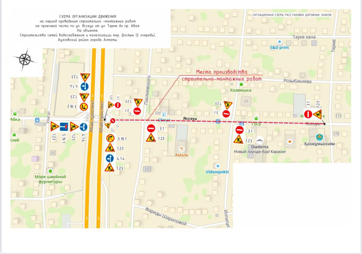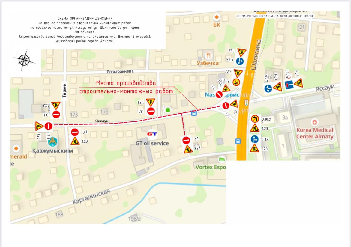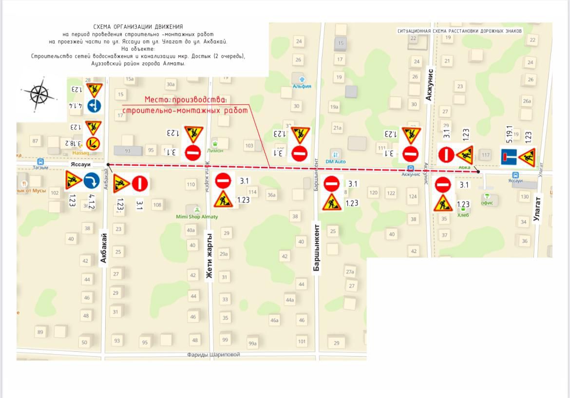 Достық шағынауданының аумағында су құбыры мен кәріз желілерін тарту бойынша құрылыс-монтаж жұмыстарының басталуына байланысты 2025 жылғы 9 шілде мен 30 тамыз аралығында Яссауи көшесі кезең-кезеңімен толық шектеледі: