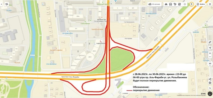 Асфальт жабынын төсеу жұмыстарына байланысты әл-Фараби даңғылының Розыбакиев көшесімен қиылысындағы жолайрықтың тоннель бөлігінде 28-30 маусым аралығында кешкі сағ. 22:00-ден таңғы 06:00-ге дейін түнгі уақытта көлік қозғалысы уақытша шектеледі.