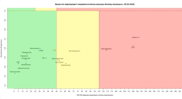 Опубликована матрица оценки эпидемиологической ситуации в регионах Казахстана на 20 февраля 2022 года, сообщает Almaty.tv со ссылкой на МВК