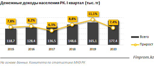В первом квартале 2020 года денежный доход в среднем на душу населения в Казахстане составил 177,4 тыс. тг — на 7,4% больше, чем в аналогичном периоде прошлого года (165,1 тыс. тг).