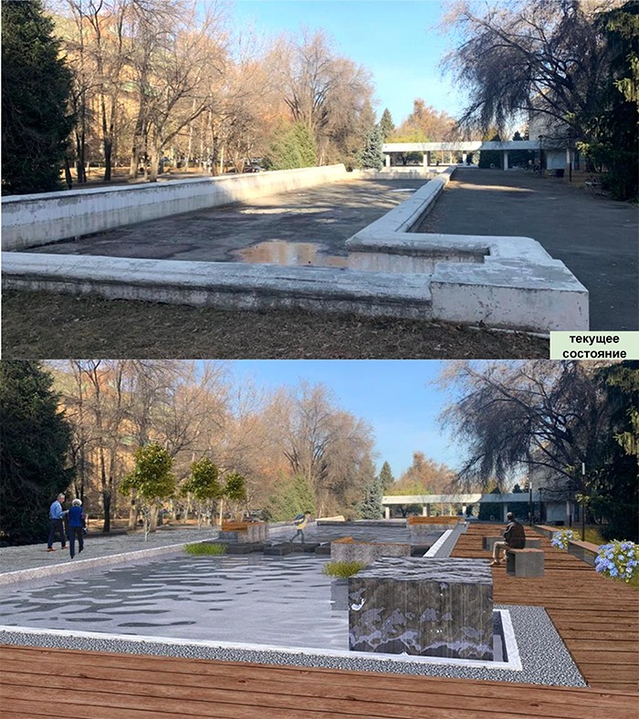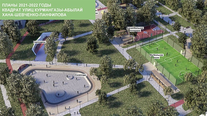 В планах акимата обновить зеленые насаждения – провести санитарную обрезку, посадку и полив газона, а также заменить уличную мебель – скамейки, урны, установить дополнительные сидячие места, питьевой фонтан и уличное освещение. Предлагается открытое зеленое пространство использовать для проведения семейных пикников и подвижных игр.
