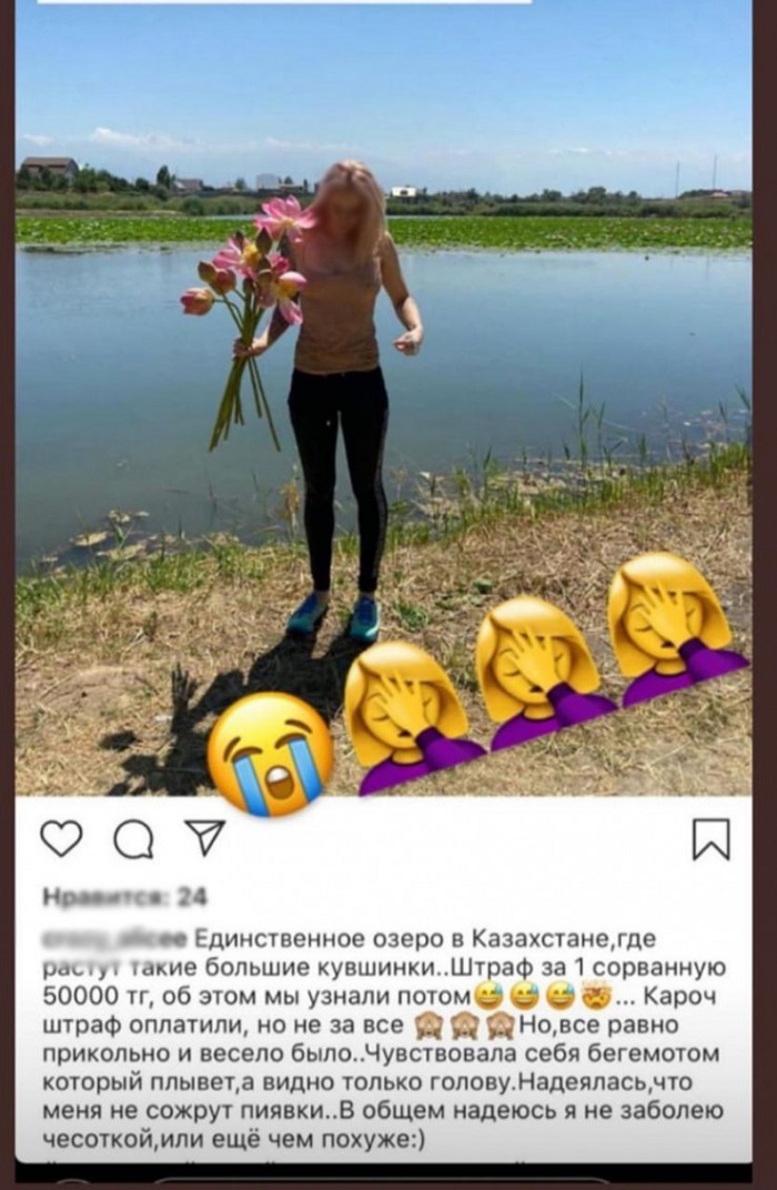"Каждый день читаю новости и удивляюсь нашим людям. Сегодня увидели в инстаграме девушку, которая с гордостью выкладывала то, как она лезла через пруд, проваливаясь в воду, но нарвала лотосов. Такие красивые лотосы, которые завозят и разводят у нас в единственном месте еще и выложила себя с охапкой! Я честно не понимаю смысла, ведь она даже до дома их не успеет довезти. У нас осталось так мало красивых мест, которые еще не успели загадить и испортить люди, что даже зачастую не хочется делиться такими чудесными локациями", - возмутилась жительница Алматы Юлия Низамова.