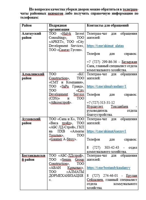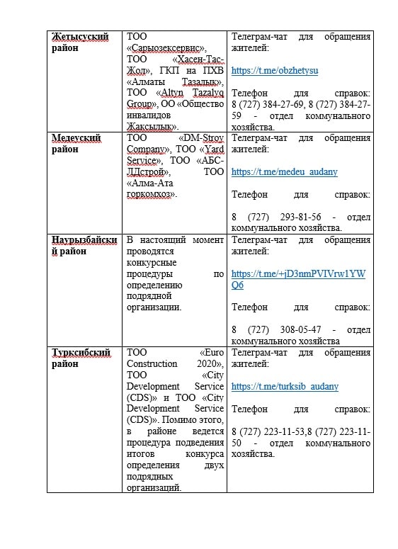 Во всех районах, включая Бостандыкский, завершены конкурсные процедуры по определению подрядчиков и заключению договоров по уборке дворовых территорий мегаполиса, - передает Almaty.tv.