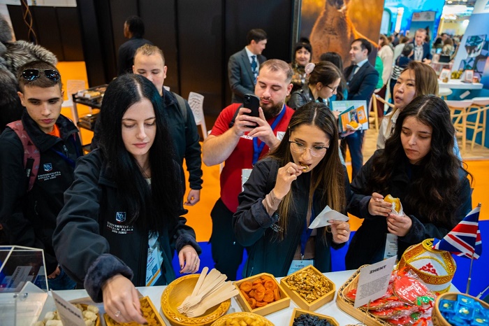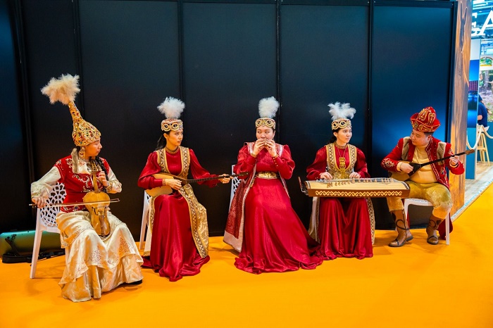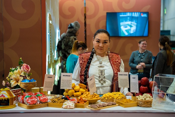 На стенде Алматы гости выставки познакомились с культурой и атмосферой города: звучит живая музыка на домбре и кобызе, проходят выступления казахских батыров, дегустации национальных блюд - казы, баурсаков, жента и кумыса.