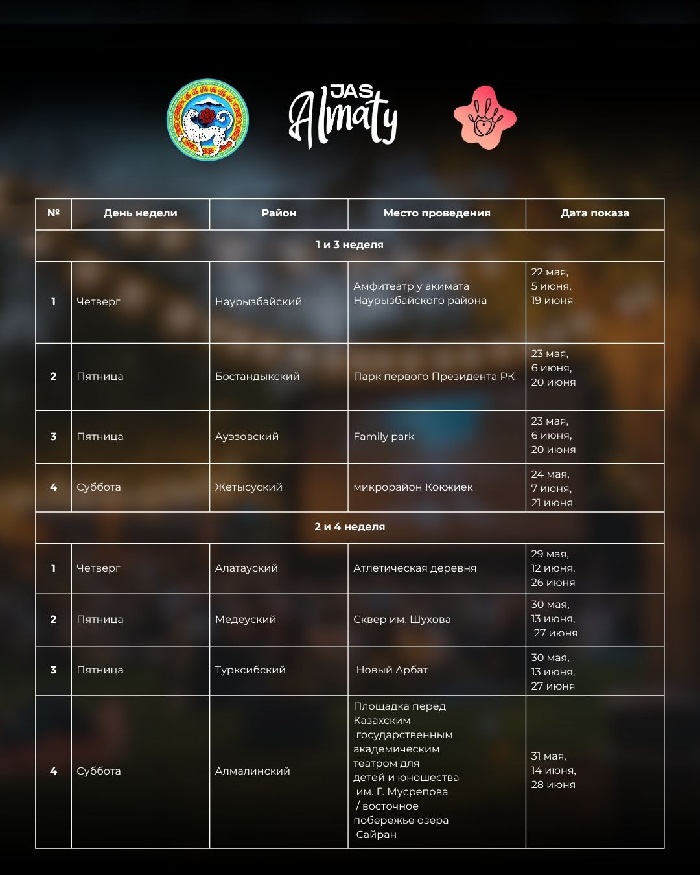 График может корректироваться в зависимости от погодных условий и технических возможностей площадок. Актуальная информация и обновления публикуются на официальной Instagram-странице проекта: @birgemiz.almaty