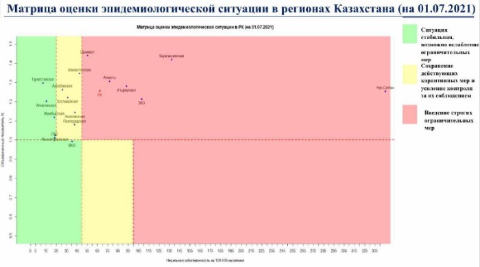 Согласно матрице оценки эпидемиологической ситуации в Казахстане на 1 июля, в «красной» зоне находятся Нур-Султан, Алматы, Шымкент, Атырауская, Западно-Казахстанская и Карагандинская области, передает Almaty.tv.