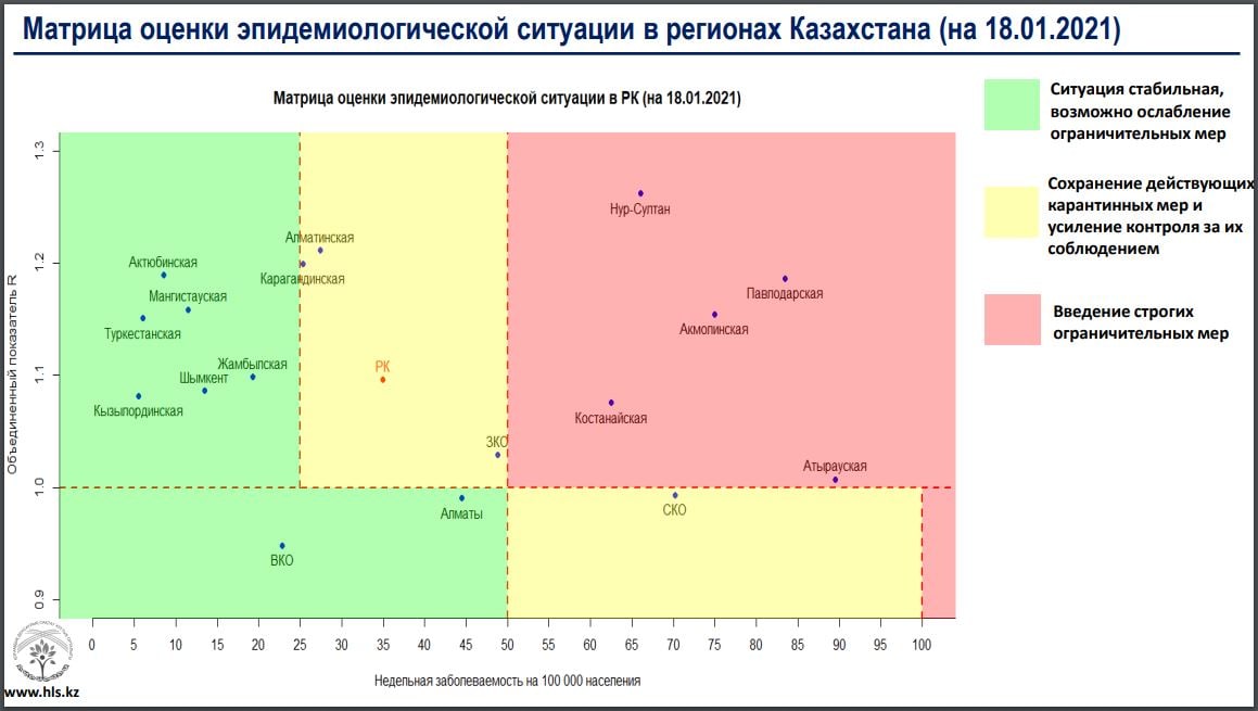 В «зелёной» зоне: Алматы, Шымкент и оставшиеся регионы.