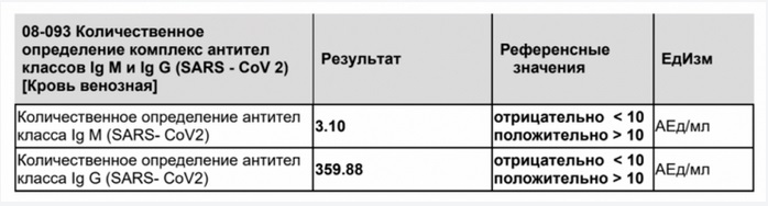 Как видно в данной таблице результатов, уровень антител класса M составляет 3,1, то есть ниже 10 единиц. Это говорит об отсутствии таких антител в крови. Вместе с тем уровень антител класса G в 360 единиц (то есть намного выше 10) говорит об их наличии в крови. Все это может означать, что, скорее всего, данный пациент переболел коронавирусной инфекцией и заражение произошло более 2 недель назад, о чем свидетельствует отсутствие ранних антител класса М и присутствие более долгосрочных антител класса G.