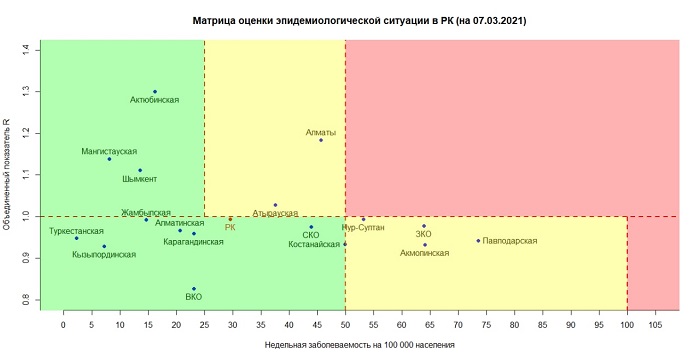 Согласно матрице оценки эпидситуации на 7 марта, в «красной» зоне по коронавирусу нет ни одной области, передает Almaty.tv.