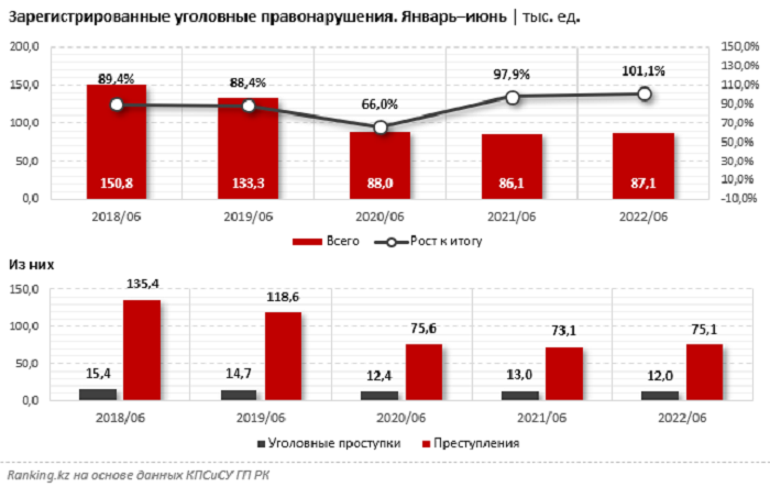 Между тем в первом полугодии 2022 года в РК зарегистрировали 87,1 тыс. уголовных правонарушений — на 1,1% больше по сравнению с аналогичным периодом 2021-го, при этом за 5 лет их количество сократилось почти в 2 раза. Из них 75,1 тыс. правонарушений (плюс 2,7% за год) относились к преступлениям, а оставшиеся 12 тыс. правонарушений (минус 7,7% за год) — к уголовным проступкам.