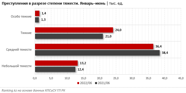Из общего числа преступлений за январь–июнь текущего года 1,4 тыс. составили особо тяжкие, количество которых за год выросло на 10,9%. Количество тяжких преступлений достигло 24 тыс. — сразу на 14,5% больше, чем годом ранее. Больше всего преступлений относилось к средней степени тяжести: 36,4 тыс. — на 5,1% меньше, чем за январь–июнь 2021 года. Количество преступлений небольшой степени тяжести выросло за год на 5,9%, до 13,2 тыс.