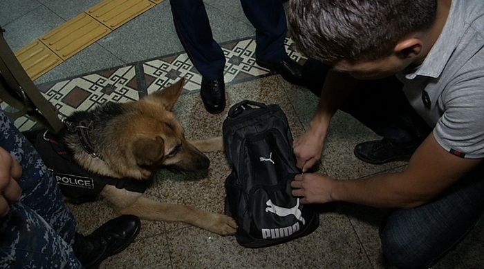 - Полиция старший сержант Байсабаев. Қол сөмкеңізді алыңызшы тексеріп жіберейік. Жерге қойыңыз.