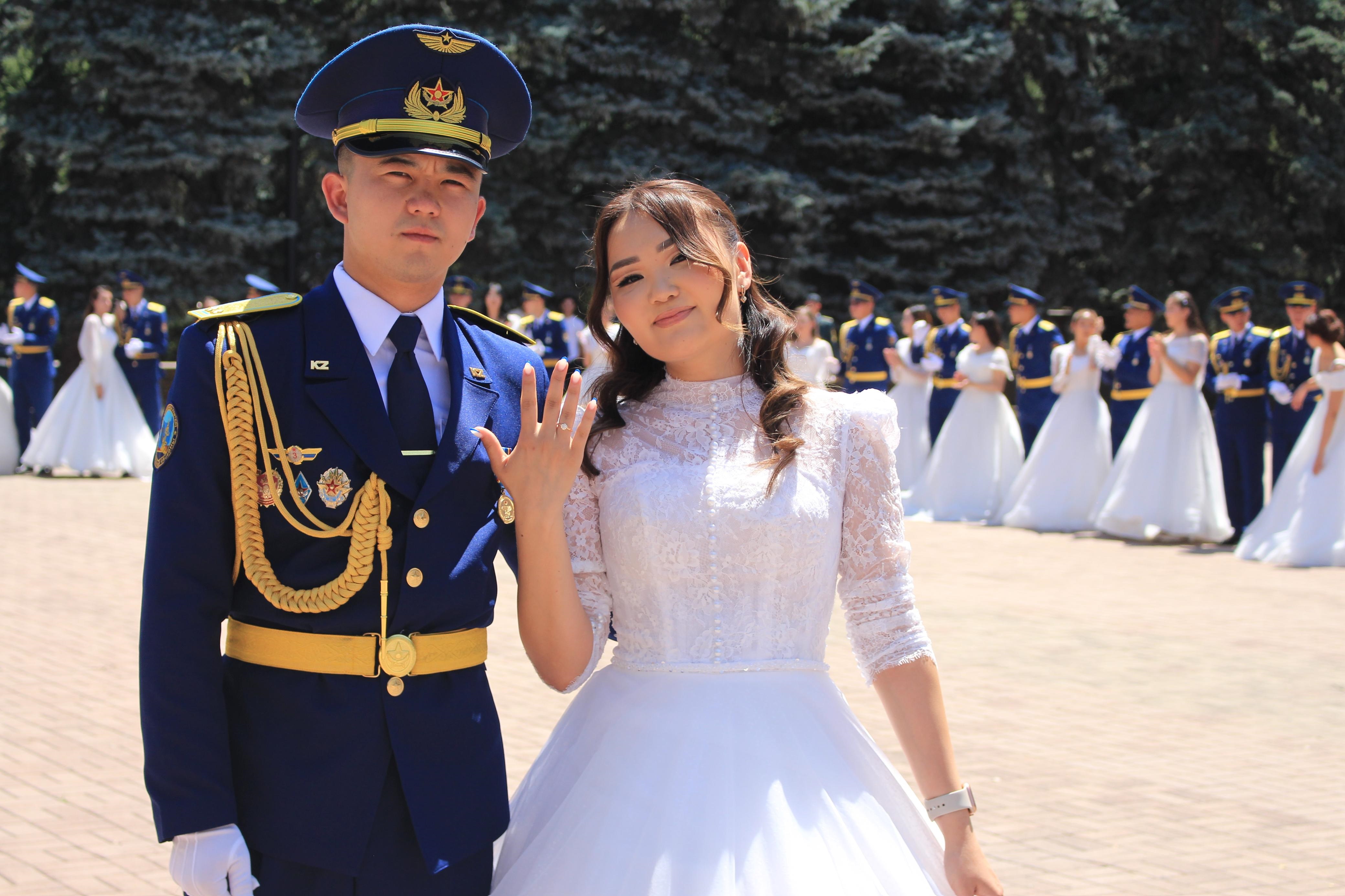 Выпускник специальности «Системы информационной безопасности» лейтенант Алишер Таласбай сделал предложение своей возлюбленной прямо под открытым небом — в атмосфере цветов, музыки и аплодисментов родных и друзей. И она сказала «да!».
