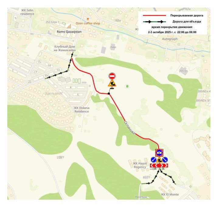 В связи с этим движение автотранспорта будет временно ограничено на участке ул. Оспанова от ЖК «Эдельвейс» до ул. Жамакаева с 22:00 2 октября до 06:00 3 октября 2025 года.