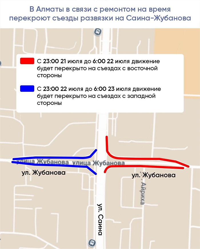 В связи с проведением среднего ремонта съездов транспортной развязки на пересечении улиц Саина и Жубанова, вводятся временные ограничения движения, - передает Almaty.tv.