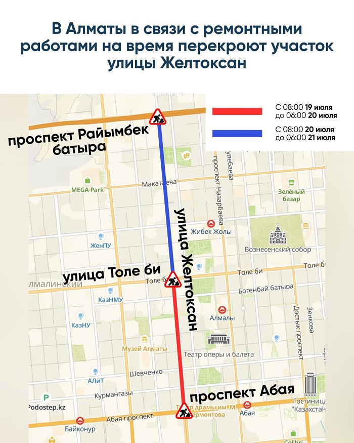 С 08:00 20 июля до 06:00 21 июля движение будет перекрыто на участке от улицы Толе би до проспекта Райымбек батыра.
